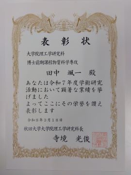 令和8年3月18日、学術研究活動において顕著な業績を挙げたと認められた理工学研究科・理工学部学生を表彰する、理工学研究科長表彰にて、材料理工学コースの博士前期課程1年の田中颯一さんが表彰されました。